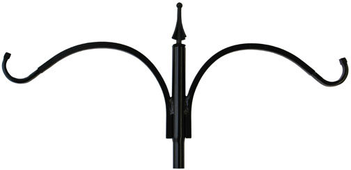 Wrought iron heavy duty two arm pole top hanger. Arms are made with 7/16″ Square iron. Cold formed hook ends provide an attractive appearance. Removable Finial topper included. Powdercoated black.